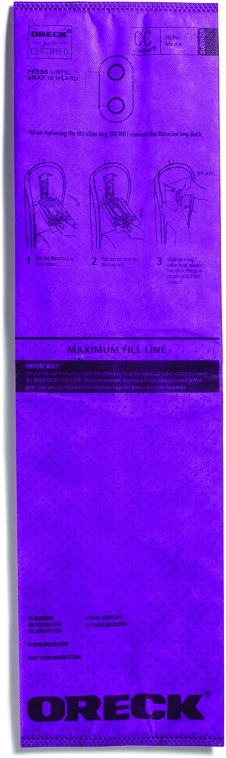5 Layers of HEPA Media filtration trap at least 99. 97% of even non-visible particles SaniSeal System automatically locks in allergens, dirt & debris upon disposal, significantly reducing the "dust puff" created by other vacuums. Extra-large capacity: holds up to 4x the amount of dust, dirt and debris of a typical bagless vacuum. For optimal performance, change filtration bag when maximum fill line is reached. Perfect for users with allergy problems in their home & for pet owners Compatible with the new Oreck ELEVATE Upright Vacuum Collection & all Oreck vacuums with docking systems; to ensure optimal filtration & cleaning performance, only use Oreck Certified Filtration Bags.